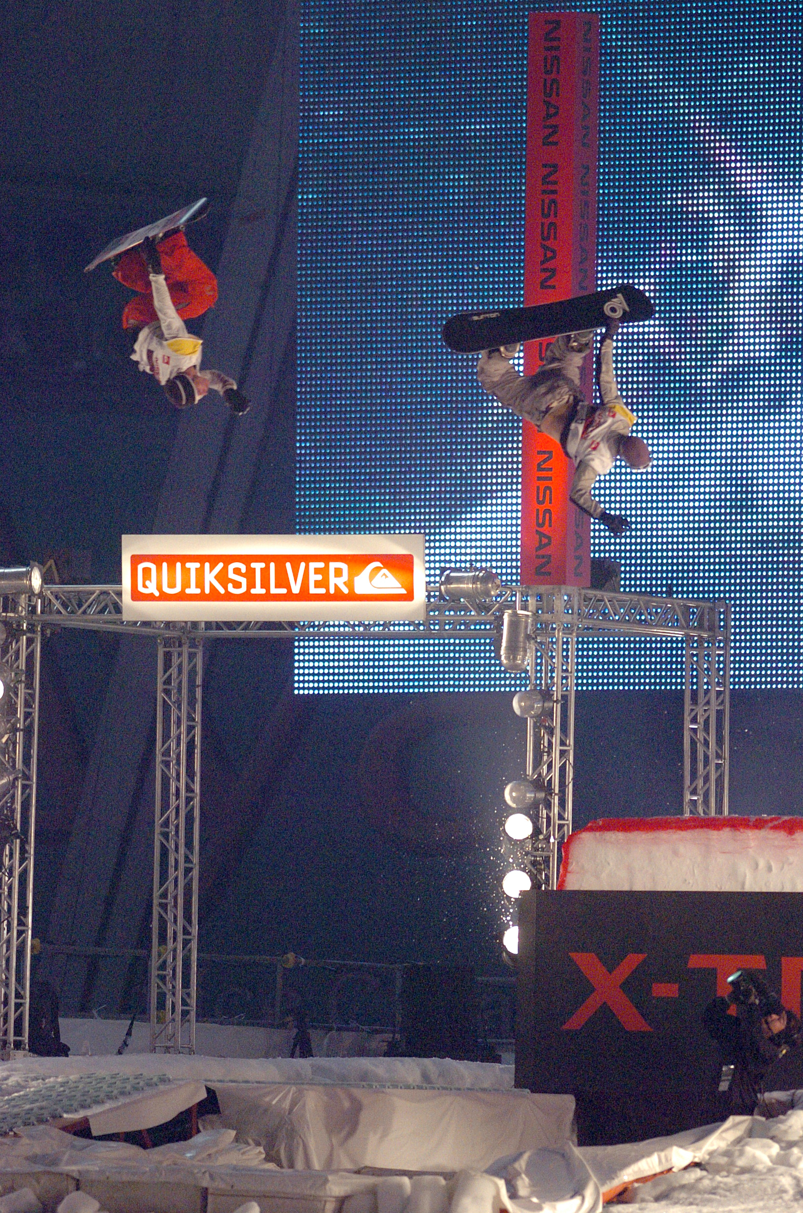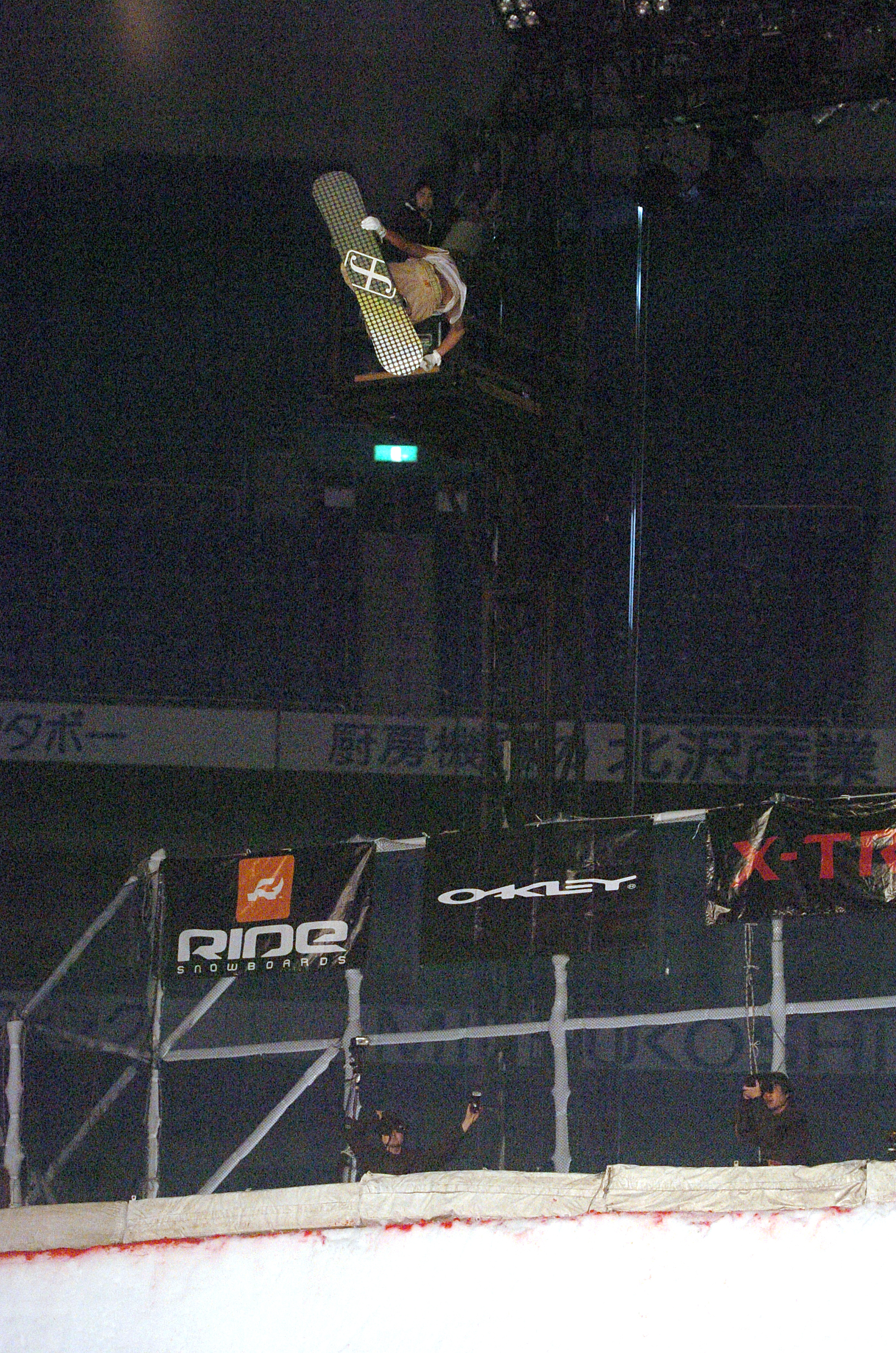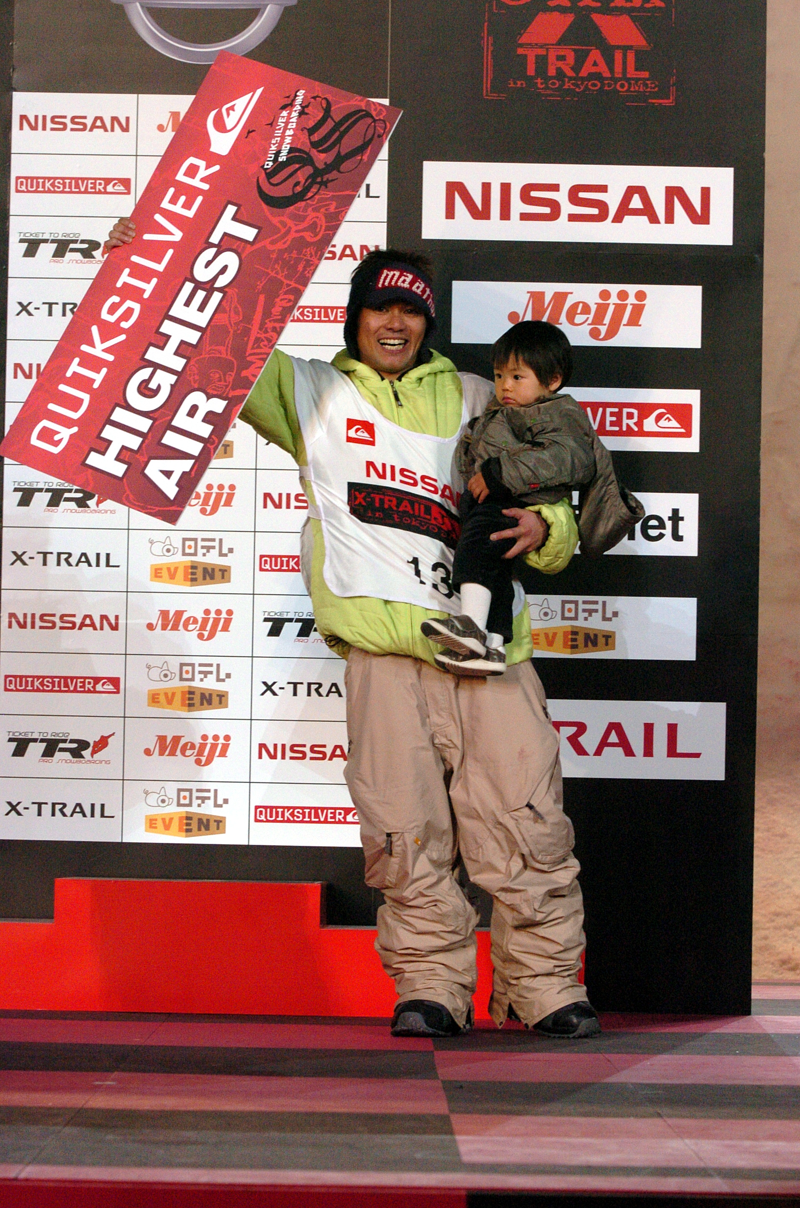 そして、今回の思い出の1枚は、5年目を迎えた2004年のX-TRAIL JAM。限界ギリギリまでチャレンジするライオと、スノーボードの楽しさを表現してくれる外国人ライダーの姿(写真は、テリエとヨナス・エメリーの公開練習でのバックフリップ)は、今でもはっきり脳裏に刻まれている。ライオがクォーターパイプで5m20cm を飛び、2年連続ハイエスト・エアを獲得し、自分の子供抱いて表彰台に上がった姿は、全てのオーディエンスを感動の渦に巻き込んでいた。